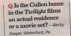 A: While I’m on hold with Hollywood, let me take a few minutes to remind you that America is at war with two (or three) countries right now, tragedy is running rampant around the globe, we’re currently in the midst of The Great Depression II, and the world is running out of bees. But using your one question to inquire about the Twilight house is a good use of…wait…hold on.