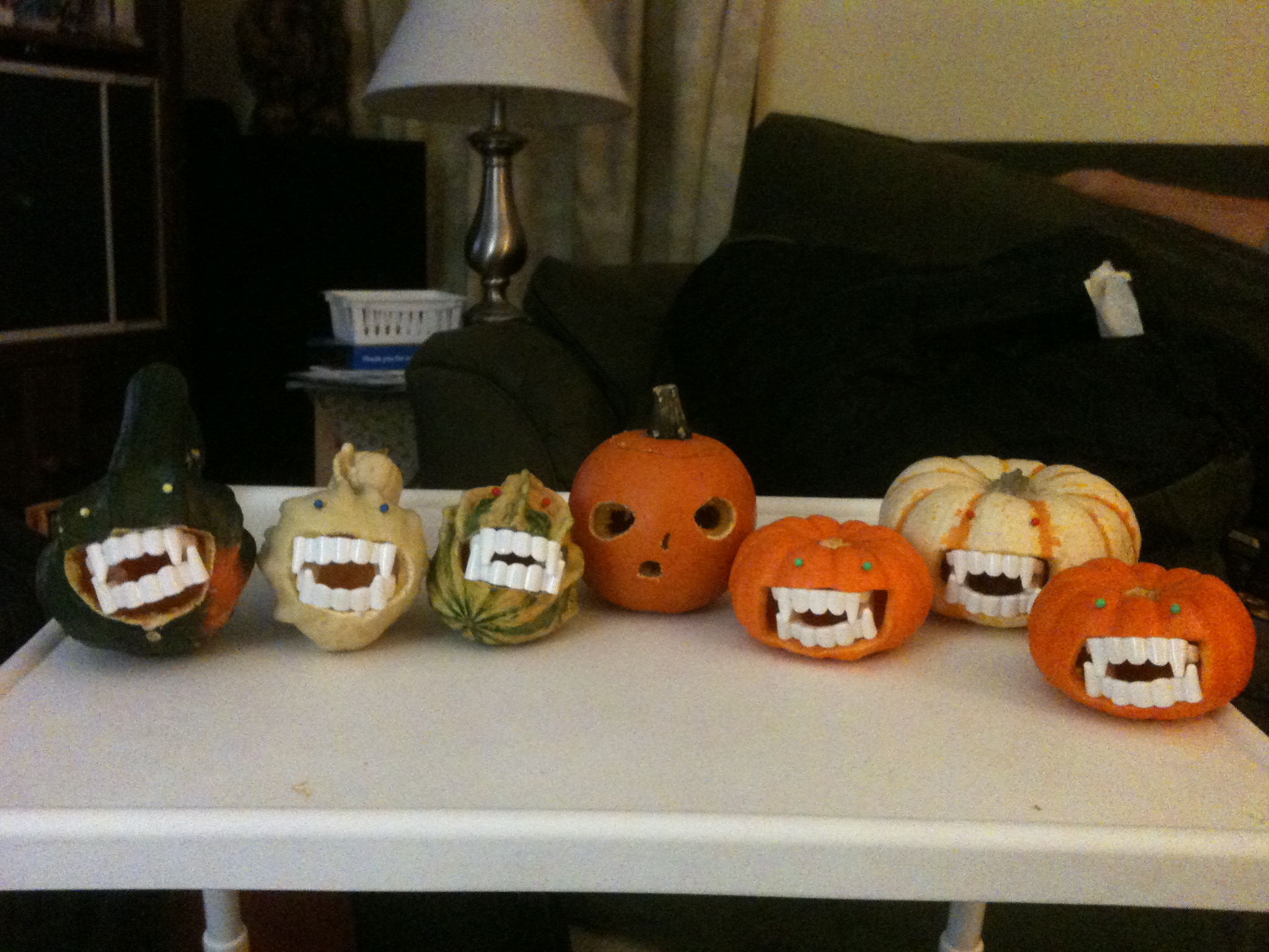 We stole the idea of using the teeth and pushpins from Martha Stewart, but made our own modifications. Instead of limiting ourselves to pumpkins, we carved some gourds, which already look like evil fish. And we did this while watching Jaws. Saturdays rule.