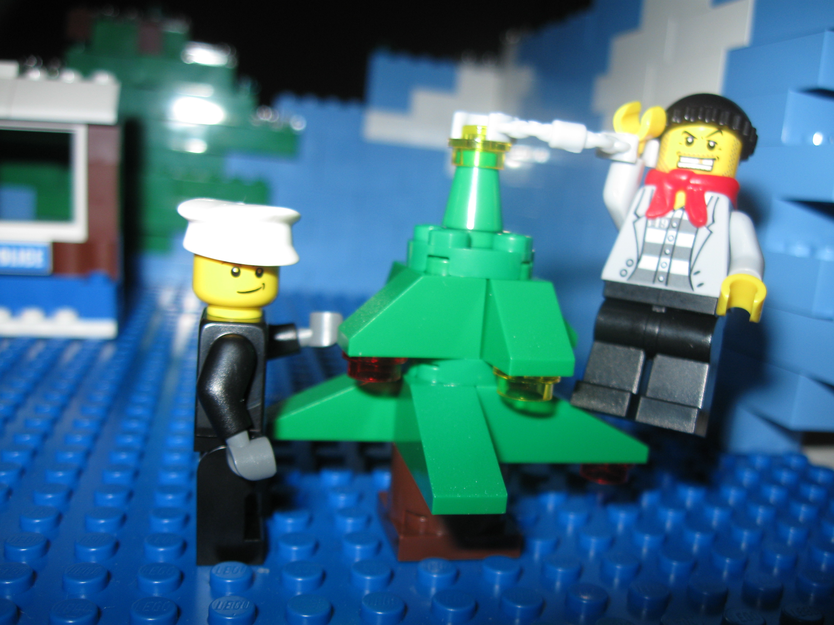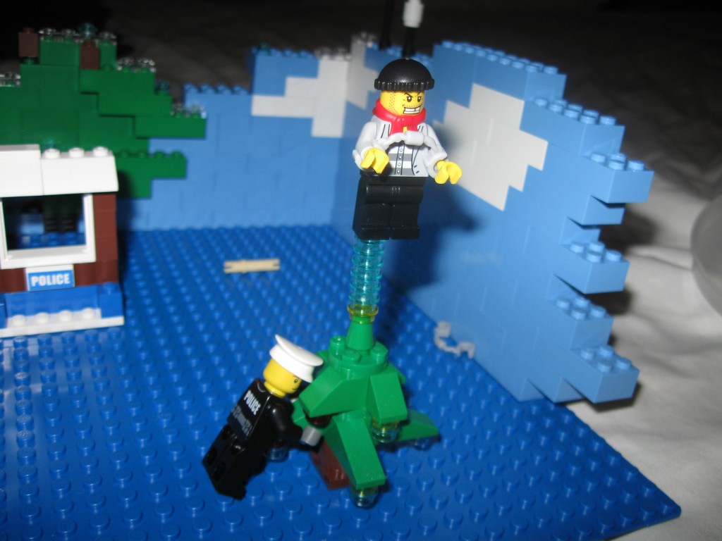The tree comes with only a few small “ornament” pieces. Luckily when I went to the Lego Store, I filled up the Pick-A-Brick cup with an unnecessary amount of what I called Blue Power Crystals, which I used to further decorate the tree. And now The Walrus is foolishly trying to hop over the wall of reality. That can’t be good.