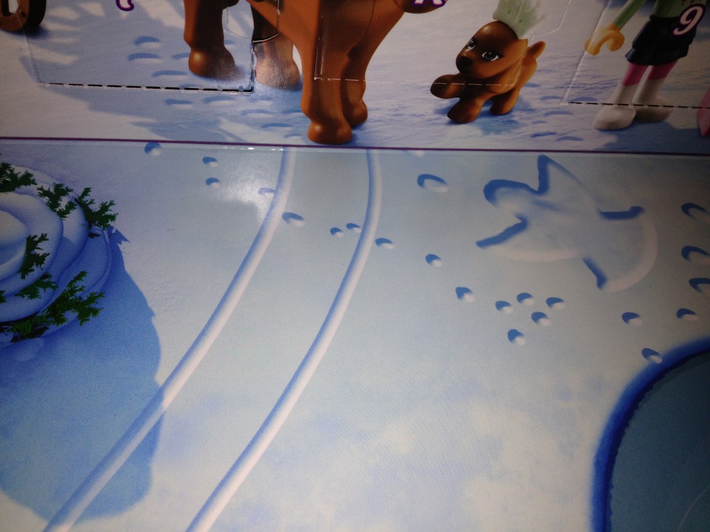 There’s something I didn’t really notice until now. The playmat (which is part of the calendar) is illustrated with a cute winter scene like always, but up in the right corner, something tragic happened.
