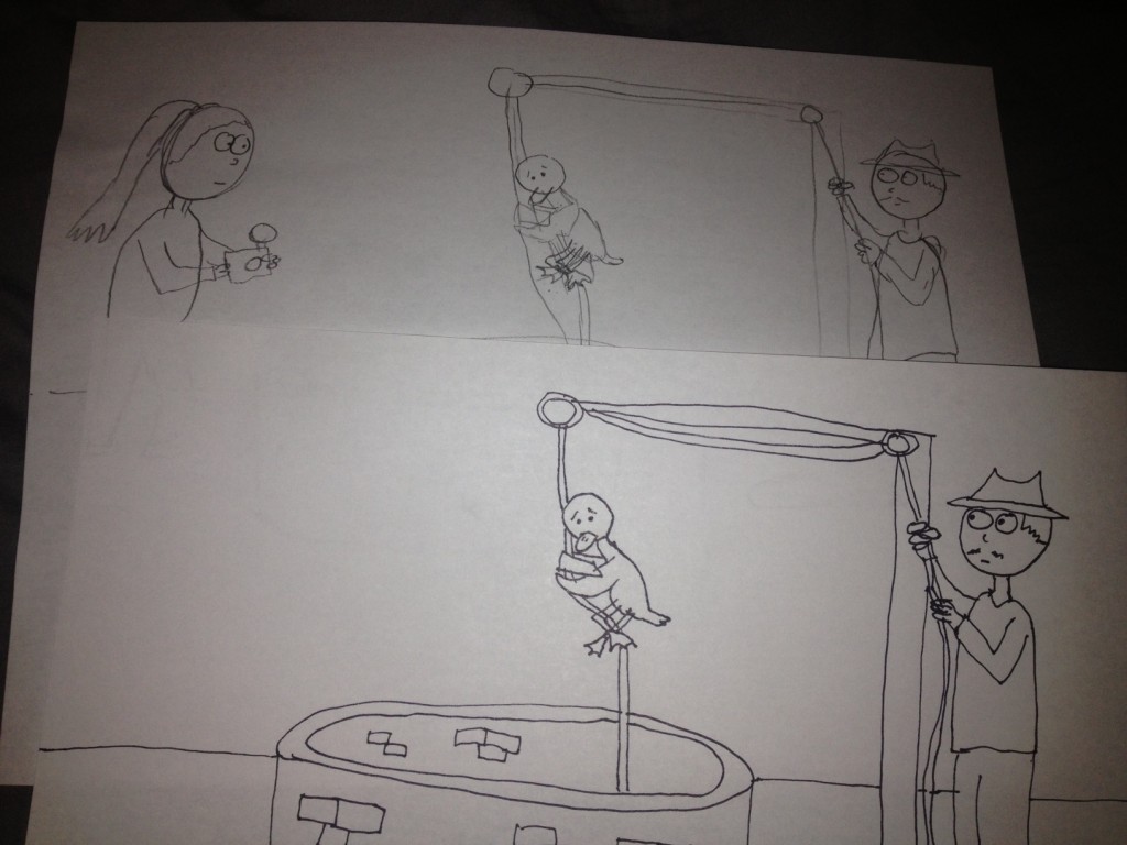 Here’s an example. You can see in the original sketch there was a woman. She got edited out of the Sharpie draft. Poor thing.