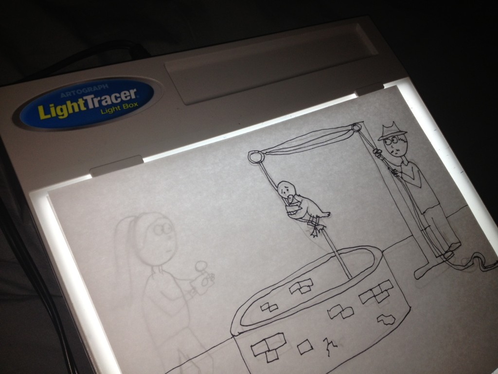 Now I would make a drawing in pencil, put that page on the lightbox, and trace the lines I wanted to keep in Sharpie. Then scan, then edit, then color, etc. It was easier and everything flowed smoothly once I got into the rhythm.