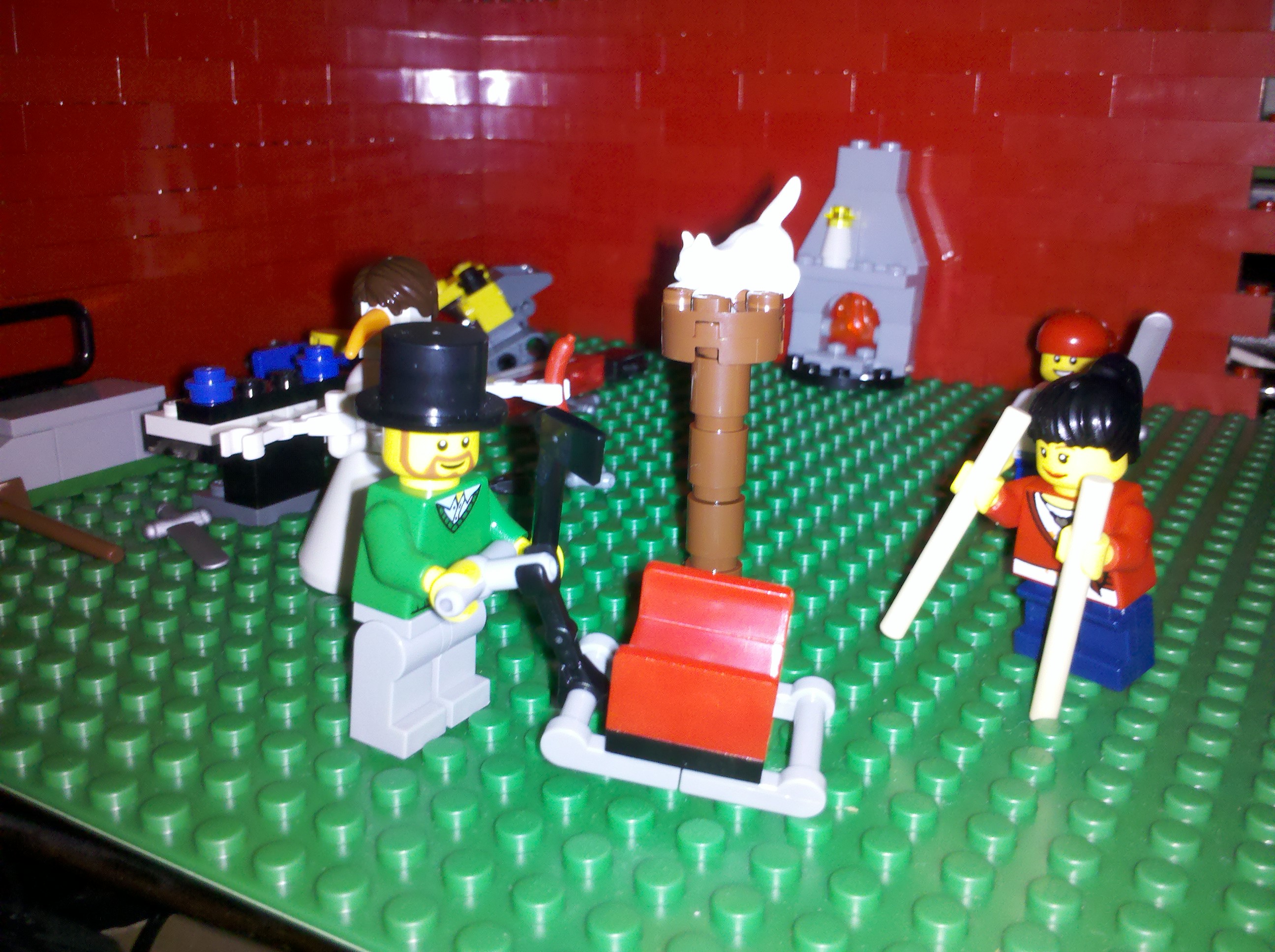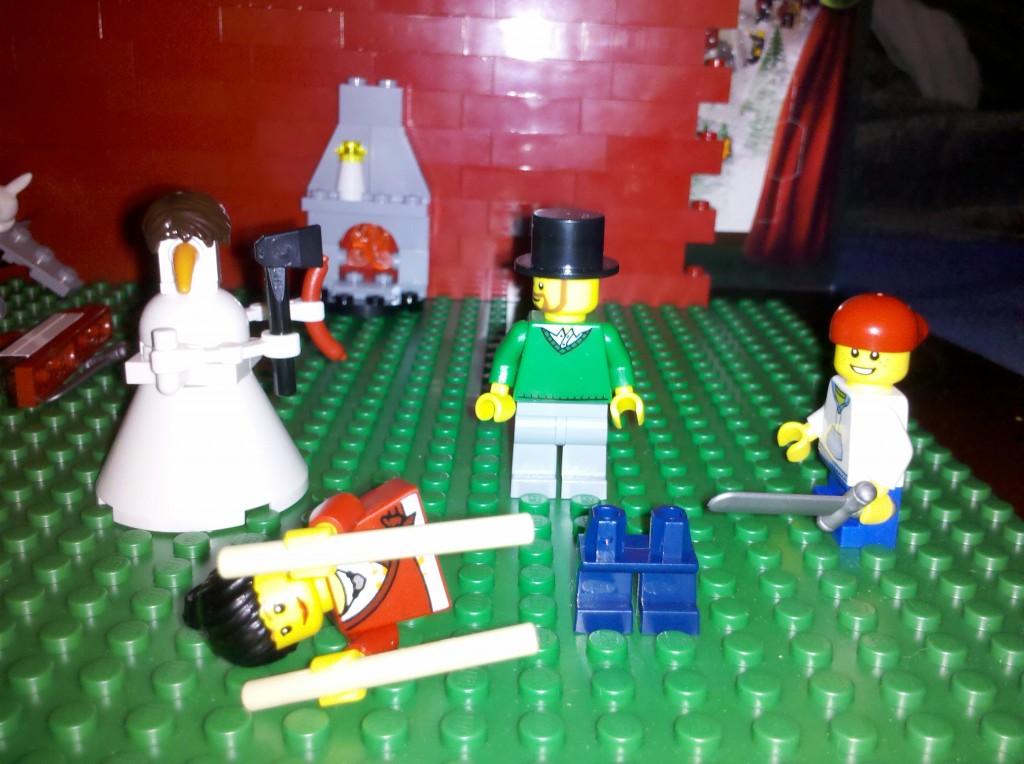 Instead of making a scene of murder, the family has used the wooden logs and ax to make a scratching post for Lego Cat. It only seems fair since Lego Werewolf was given a jetpack.