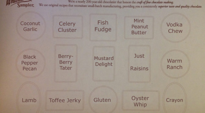 Whitman’s Sampler Index Posted on February 16, 2017 by Dan Bergstein Everyone loves a box of assorted chocolates! It’s fun to look at the index in the lid and see what type of candy you’re about to eat! (Click to enlarge)