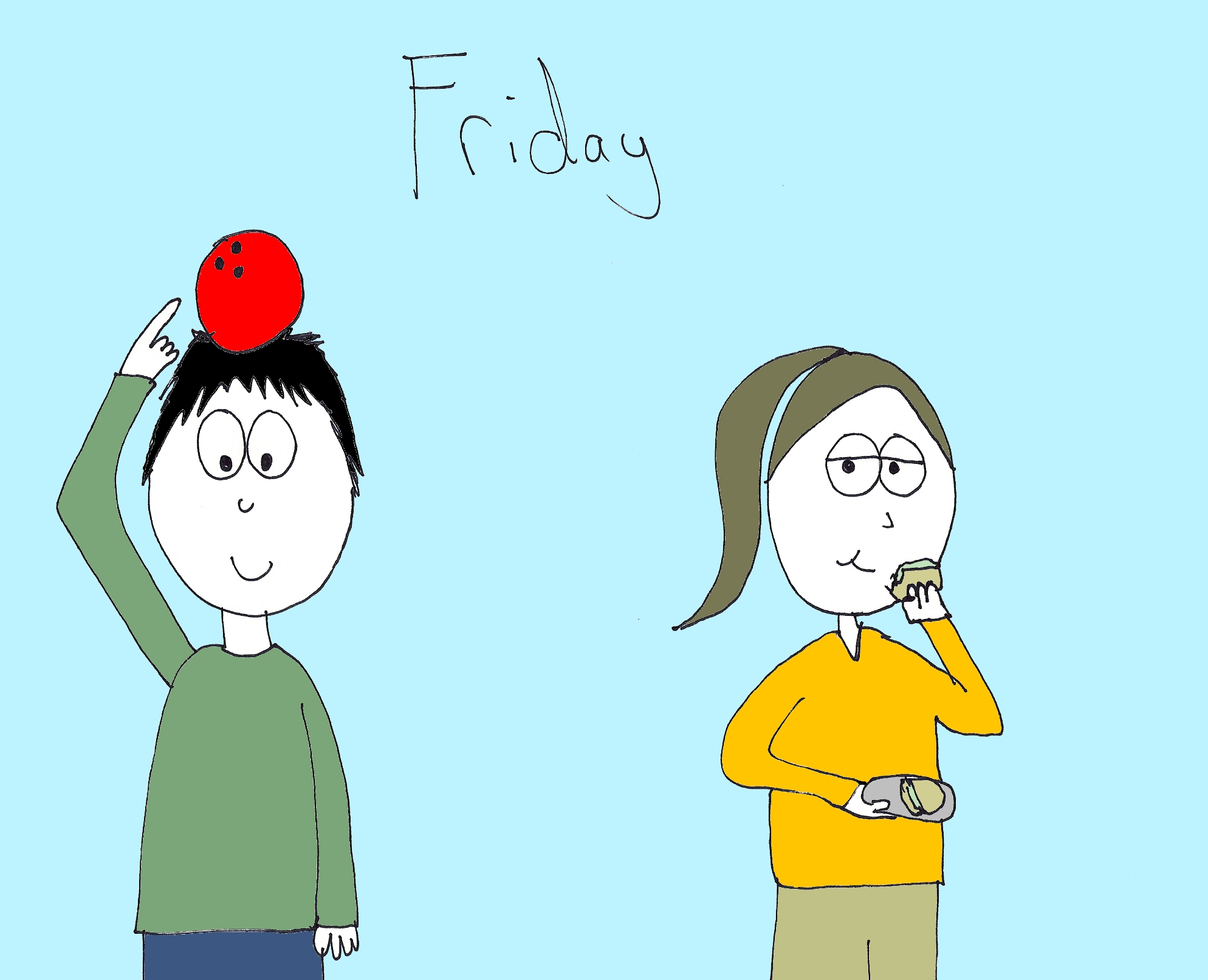 Confused, Peter takes the bowling ball.