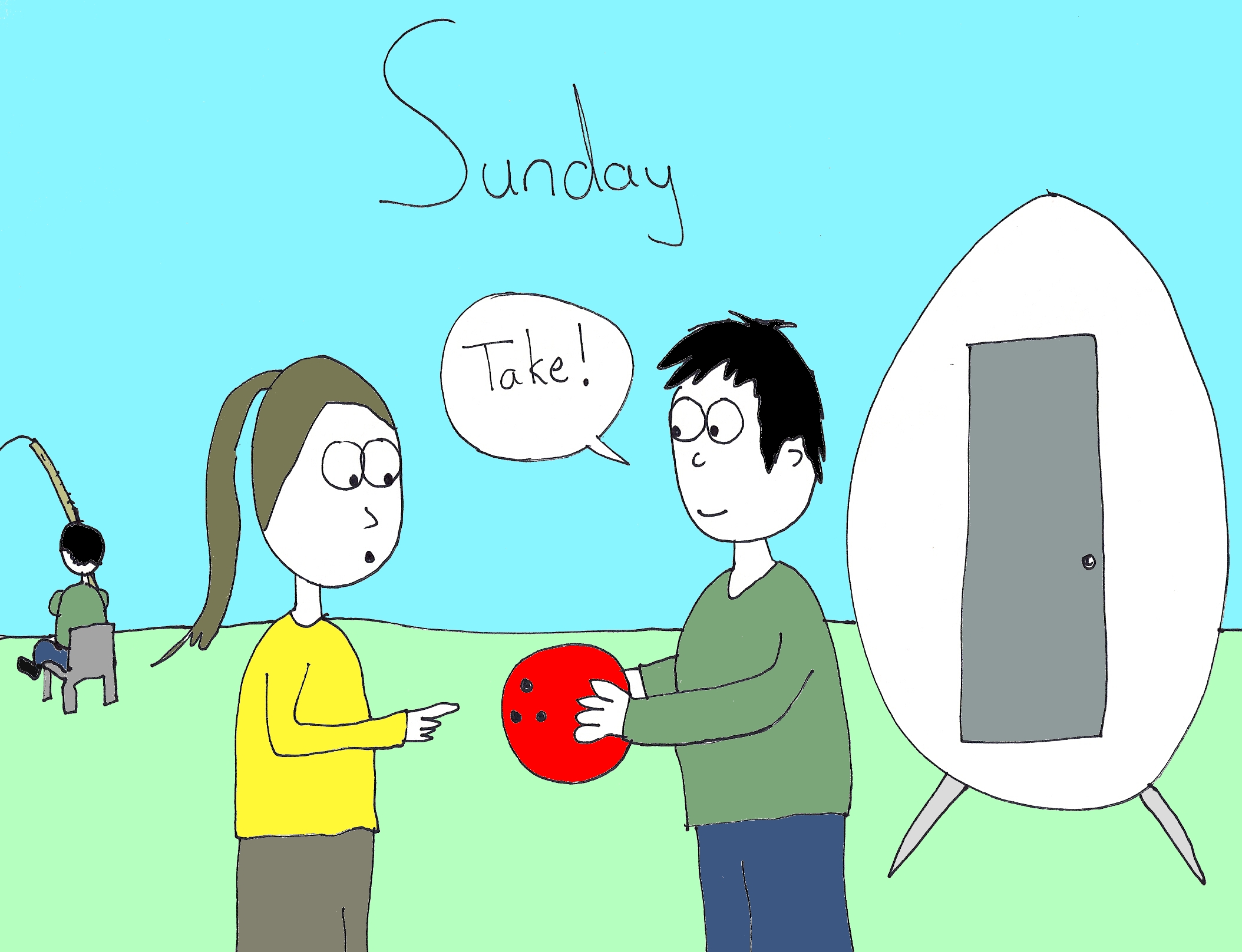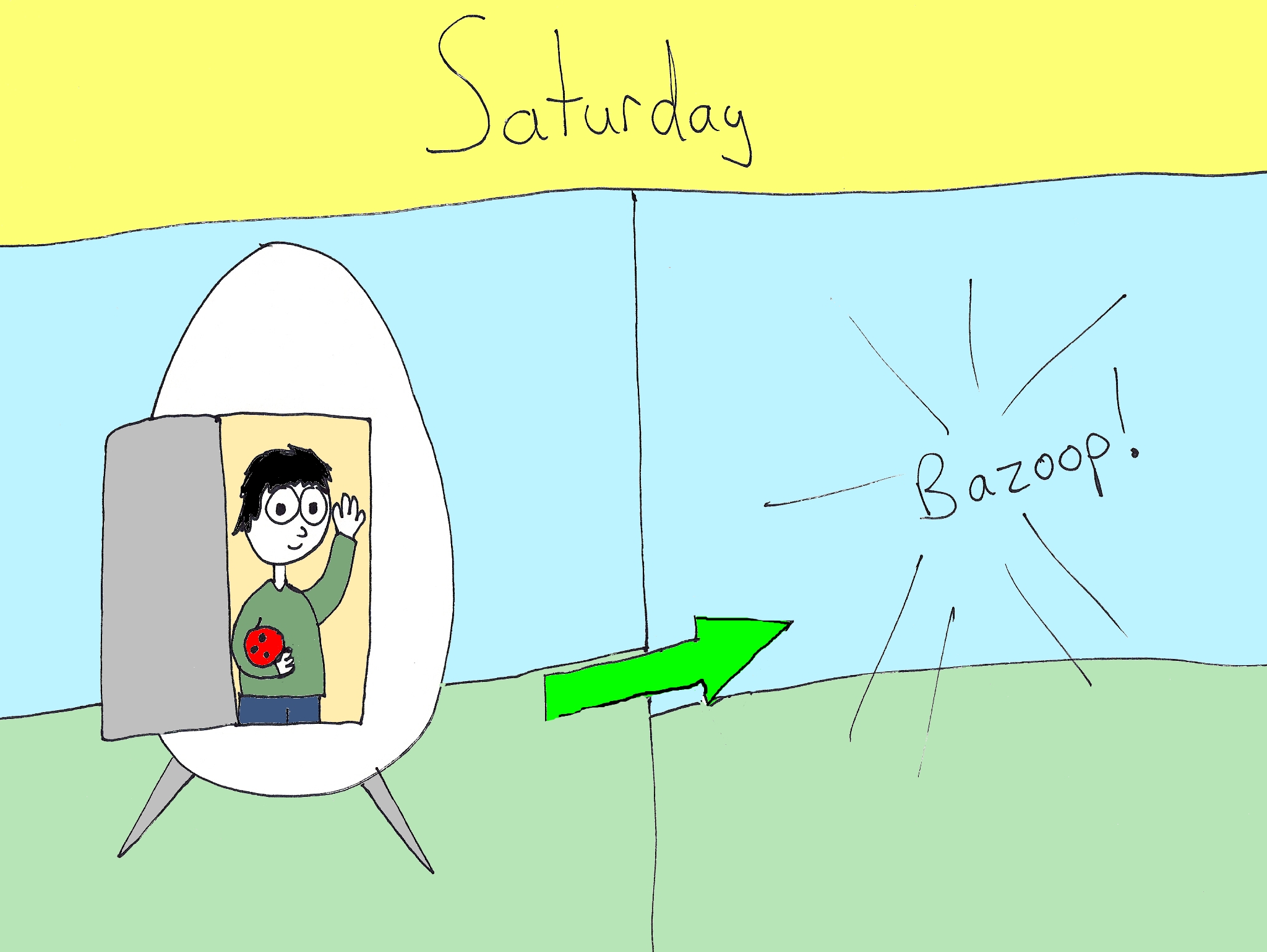 Peter discovers time travel while playing with his navel and invents a time machine. Taking the bowling ball with him, he travels back in time to Sunday, the same Sunday we discussed above. Remember? Sunday Peter is fishing, because he is a boring man, and Saturday Peter from the future barges into Lisa-Barbie’s house, gives her the bowling ball and the instructions to give him back the bowling on Wednesday, and then leaves.