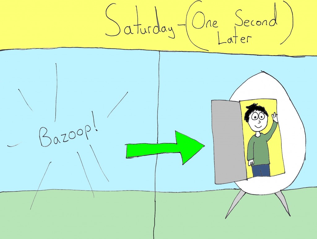 He hops into the time machine and travels to the future (his present), arriving on Saturday afternoon, one second after he had left to go back in time to Sunday.